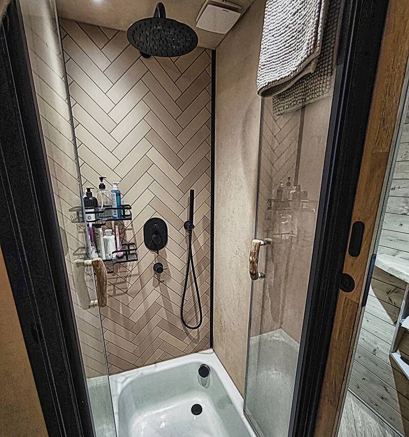 Twee glazen deuren sluiten de ruimte licht en luchtig af, terwijl de tegelwand in zachte tinten naadloos aansluit bij de kleuren van het tiny house.