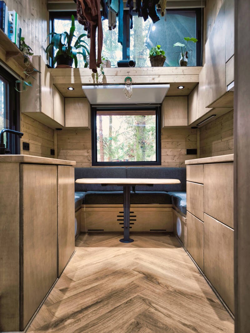 Binnen biedt de tiny house vier slaapplaatsen, slimme opbergoplossingen en een sfeervolle leefruimte. Smart verlichting, een ingebouwde surround sound installatie en een projector maken het geheel af en creëren een moderne, gezellige woonervaring.